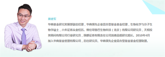 蔡建军,生物化学与分子生物学硕士,具有基金从业资格,华商基金管理有限公司研究发展部副总经理。2007年7月至2008年5月就职于哥鲁巴生物科技(北京)有限公司任研究员;2008年5月至2009年3月就职于天相投资顾问有限公司任行业研究员;2009年3月至2010年4月就职于国都证券有限责任公司任消费品组研究组长;2010年4月加入华商基金管理有限公司,曾任研究发展部行业研究员,2012年3月起至2013年12月29日担任华商领先企业混合型基金基金经理助理,2013年12月30日起至今担任华商领先企业混合型基金基金经理。