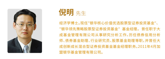 倪明先生:经济学博士。曾在大成基金管理有限公司从事研究分析工作,历任债券信用分析师、债券基金助理、行业研究员、股票基金助理等职,并曾任大成创新成长混合型证券投资基金基金经理职务。2011年4月加盟银华基金管理有限公司。自2011年9月26日起担任银华核心价值优选股票型证券投资基金基金经理,自2015年5月6日起担任银华领先策略股票型证券投资基金基金经理。