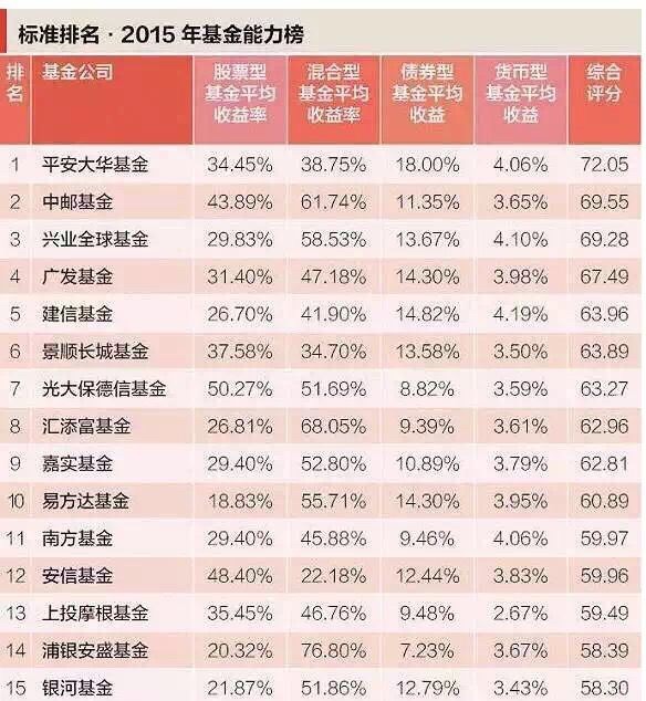 A股市场在近期的“惊心动魄”后重新回到“起点”。接下来的2016应该怎样投资再次被投资者关注。专家猜测,A股在2016年可能回归常态,恢复理性,震荡反复。投资者可以参考2015年的收益情况选择绩优产品合理布局。据悉,平安大华基金旗下产品在2015年整体表现优异,普通权益型、固定收益型以及指数型三类产品均取得同类领先的收益,为2016打下坚实基础,可谓“三阳开泰”,在标准排名推出的“2015年基金能力榜”显示,平安大华基金去年多种类型基金产品均有优异表现,年度综合实力在公募型基金公司中排名第一。据悉,2015年基金能力排行榜是通过汇总计算基金公司旗下各类型基金的平均收益率并与2015年该类型基金的市场平均收益率进行比对,高于市场平均水平的评分较高,反之较低。